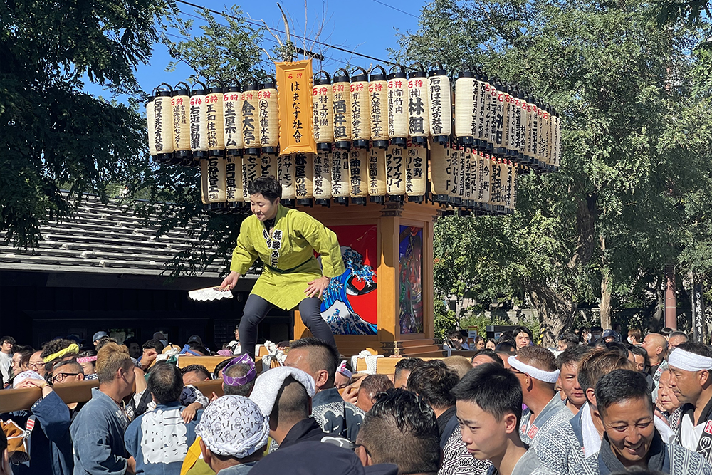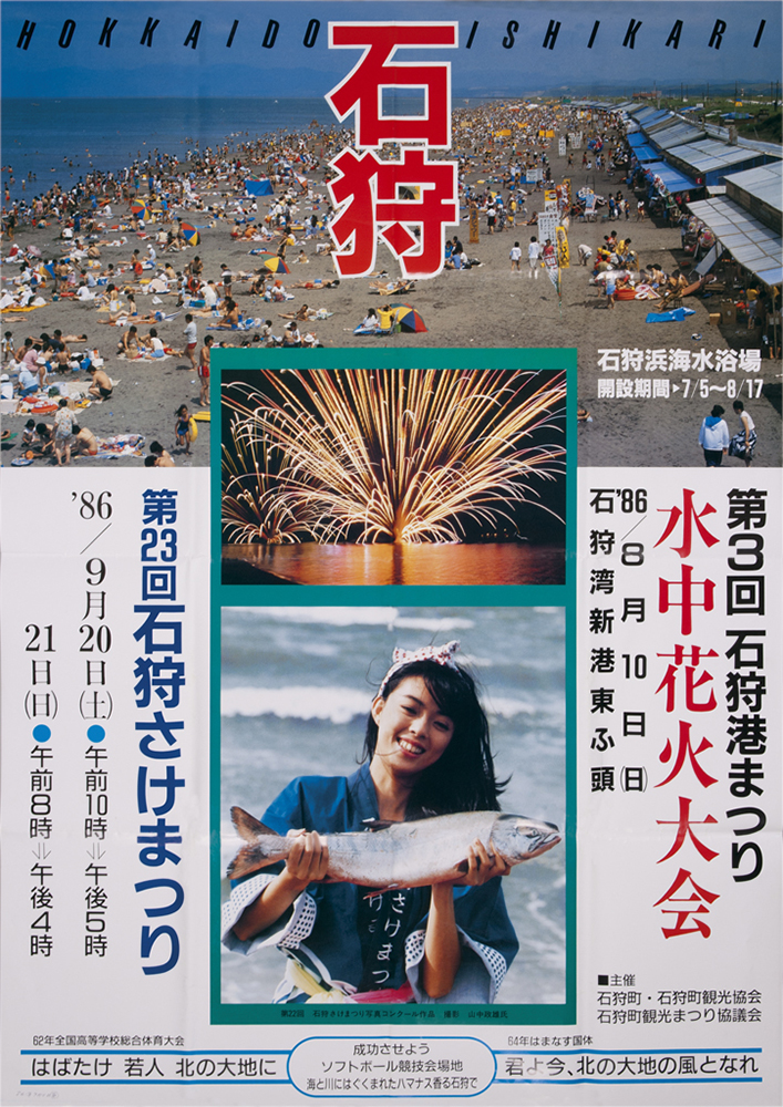 前夜祭の9月9日には、札幌市内で吹奏楽団によるパレードを行い、祭りを広くPRしました。本祭は9月10日から16日まで、石狩八幡神社の祭典とあわせて開催され、町内外から多くの人々が訪れました。祭りの見どころの一つが、石狩川で行われた流灯行事です。サケの形をした大型行灯が9基、磯舟やイカダに乗せられて川に浮かべられました。さらに子どもたちが作った二百数十の小さな行灯も加わり、夜の石狩川は無数の灯りでゆらゆらと輝きます。その幻想的な光景を見ようと、約3,000人が川岸に集まりました。翌日には、自衛隊音楽隊の演奏や札幌の芸者による舞踊も披露されました。その舞台となったのは、なんと漁で使う「馬船」を利用した特設ステージ。漁師町らしい工夫が観客を楽しませました。