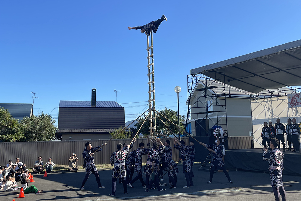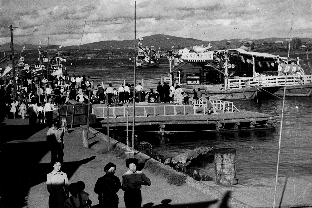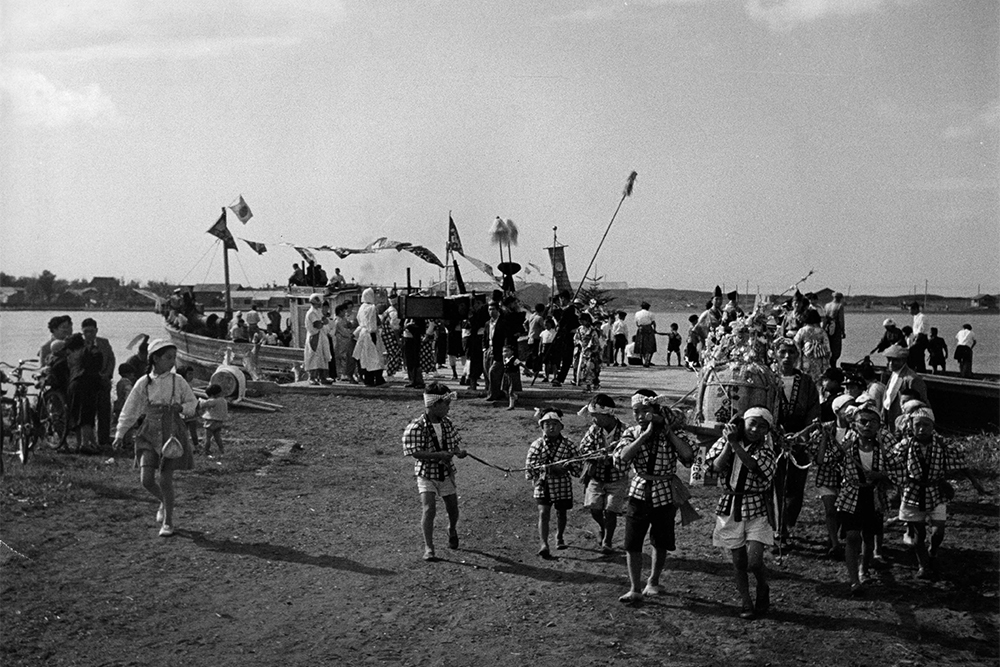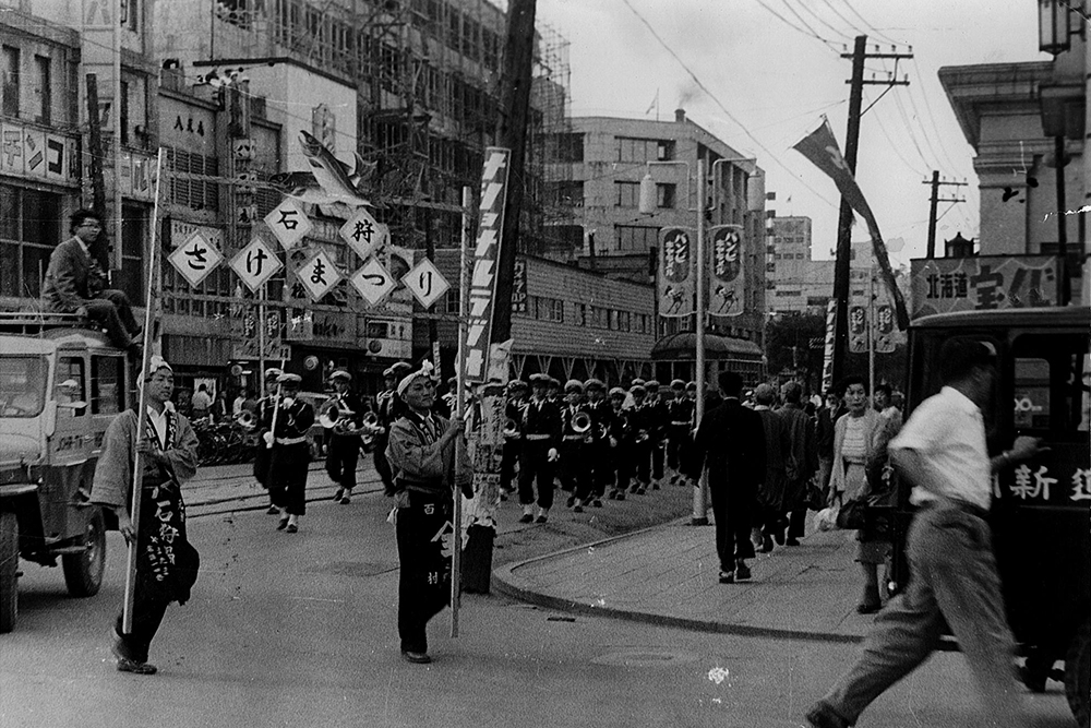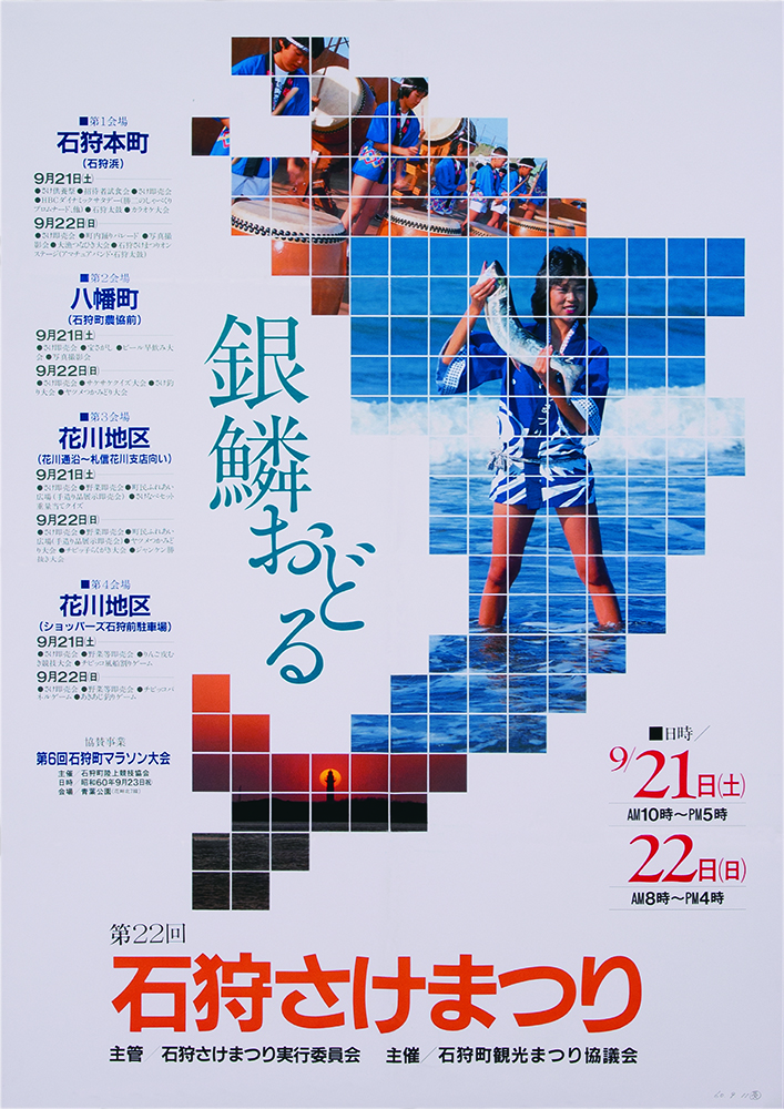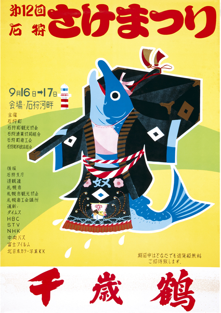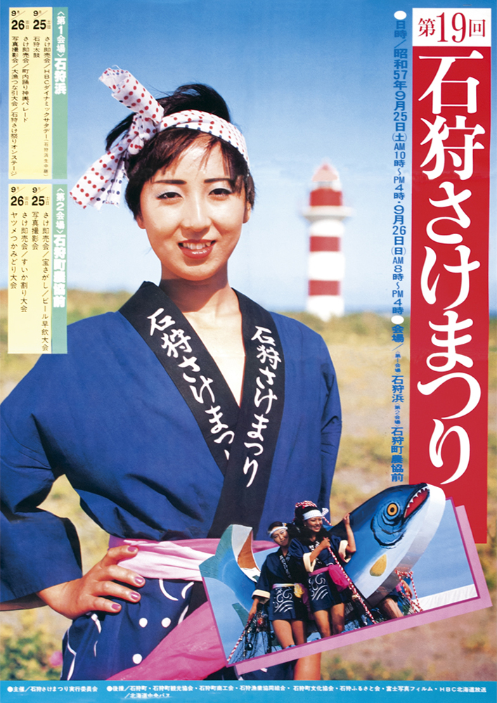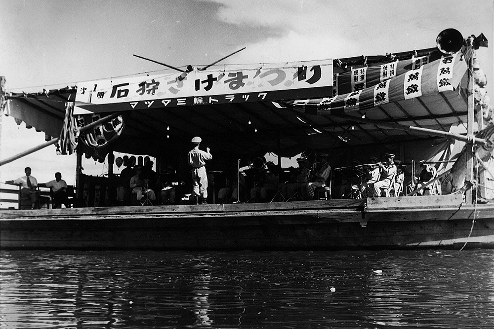 前夜祭の9月9日には、札幌市内で吹奏楽団によるパレードを行い、祭りを広くPRしました。本祭は9月10日から16日まで、石狩八幡神社の祭典とあわせて開催され、町内外から多くの人々が訪れました。祭りの見どころの一つが、石狩川で行われた流灯行事です。サケの形をした大型行灯が9基、磯舟やイカダに乗せられて川に浮かべられました。さらに子どもたちが作った二百数十の小さな行灯も加わり、夜の石狩川は無数の灯りでゆらゆらと輝きます。その幻想的な光景を見ようと、約3,000人が川岸に集まりました。翌日には、自衛隊音楽隊の演奏や札幌の芸者による舞踊も披露されました。その舞台となったのは、なんと漁で使う「馬船」を利用した特設ステージ。漁師町らしい工夫が観客を楽しませました。